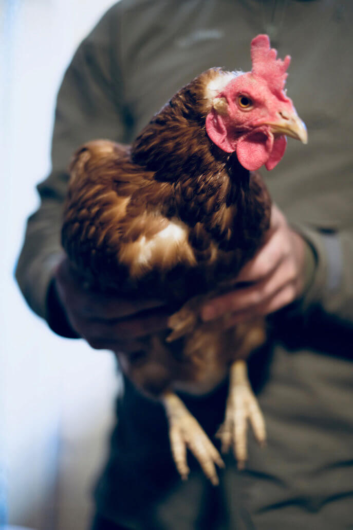 Han står på fjøstrappa med telefonen i den ene hånda og greipet i den andre.